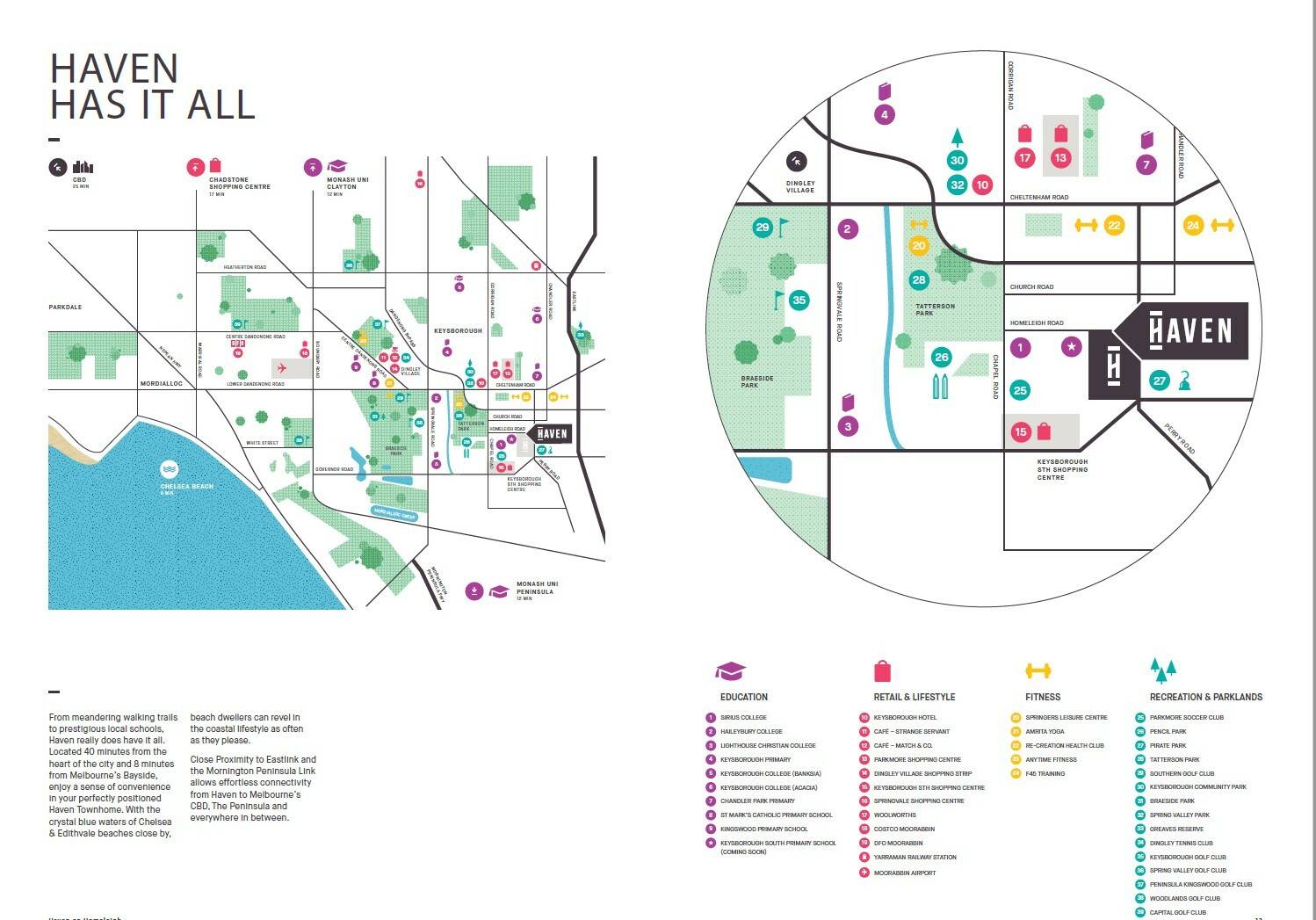 • Haven处于安静的位置周边又有现代便利设施。新的Keysborough South购物中心距离别墅仅有2分钟路程,您可以在这里找到超市Woolworths, Keys Medical Center和各种日常用品专卖店。 位于公园Tatterson Park内的休闲中心Springers Leisure Centre为爱好运动的人提供健身设施,瑜伽课,体育俱乐部,羽毛球和排球场.